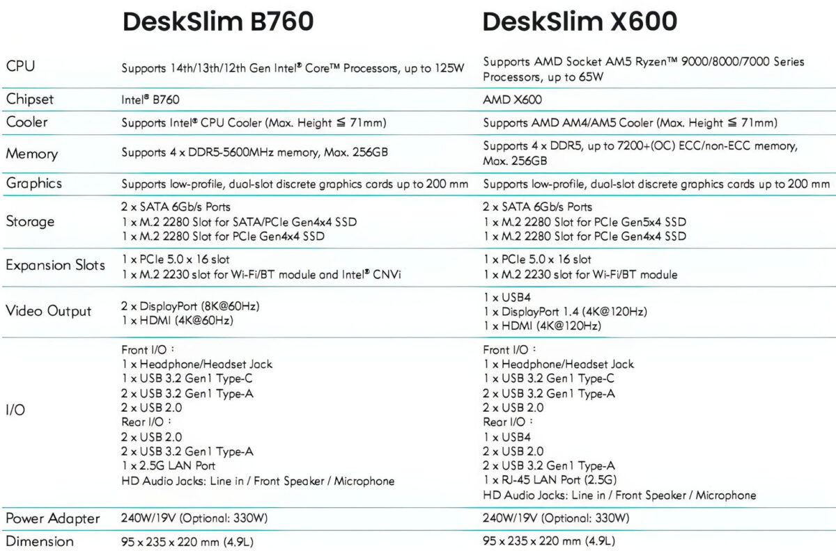Оснащение ASRock DeskSlim B760/X600 включает четыре разъёма под модули оперативной памяти DDR5 (максимальный объём 256 ГБ), два порта SATA 6 Гбит/с и пару разъёмов M.2 для твердотельных накопителей. Ещё один M.2 предназначен для беспроводного модуля. Оба компьютера поддерживают установку CPU-кулера высотой до 71 мм и комплектуются внешним блоком питания номиналом 240 или 330 Вт. Остальные спецификации новинок приведены ниже.