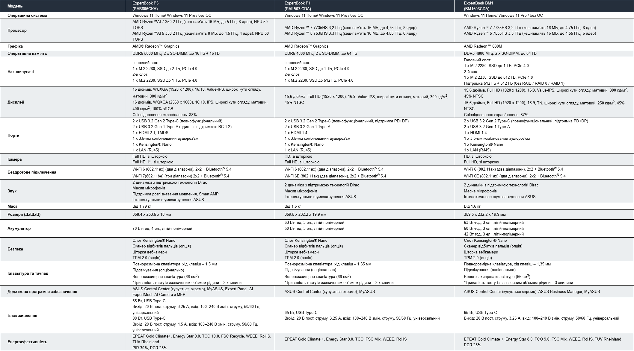 В то же время модели ASUS ExpertBook P1 и ExpertBook BM1 получили процессоры семейства AMD Rembrandt‑R на базе архитектуры Zen 3+. Они оснащаются 15,6‑дюймовыми экранами с разрешением 1920×1200 пикселей, оснащены двумя разъёмами под модули ОЗУ SO-DIMM DDR5-4800 и поддерживают установку пары NVMe-накопителей. Ёмкость аккумулятора составляет от 42 до 63 Вт·ч в зависимости от модели. Остальные спецификации новинок ASUS собраны в таблице.