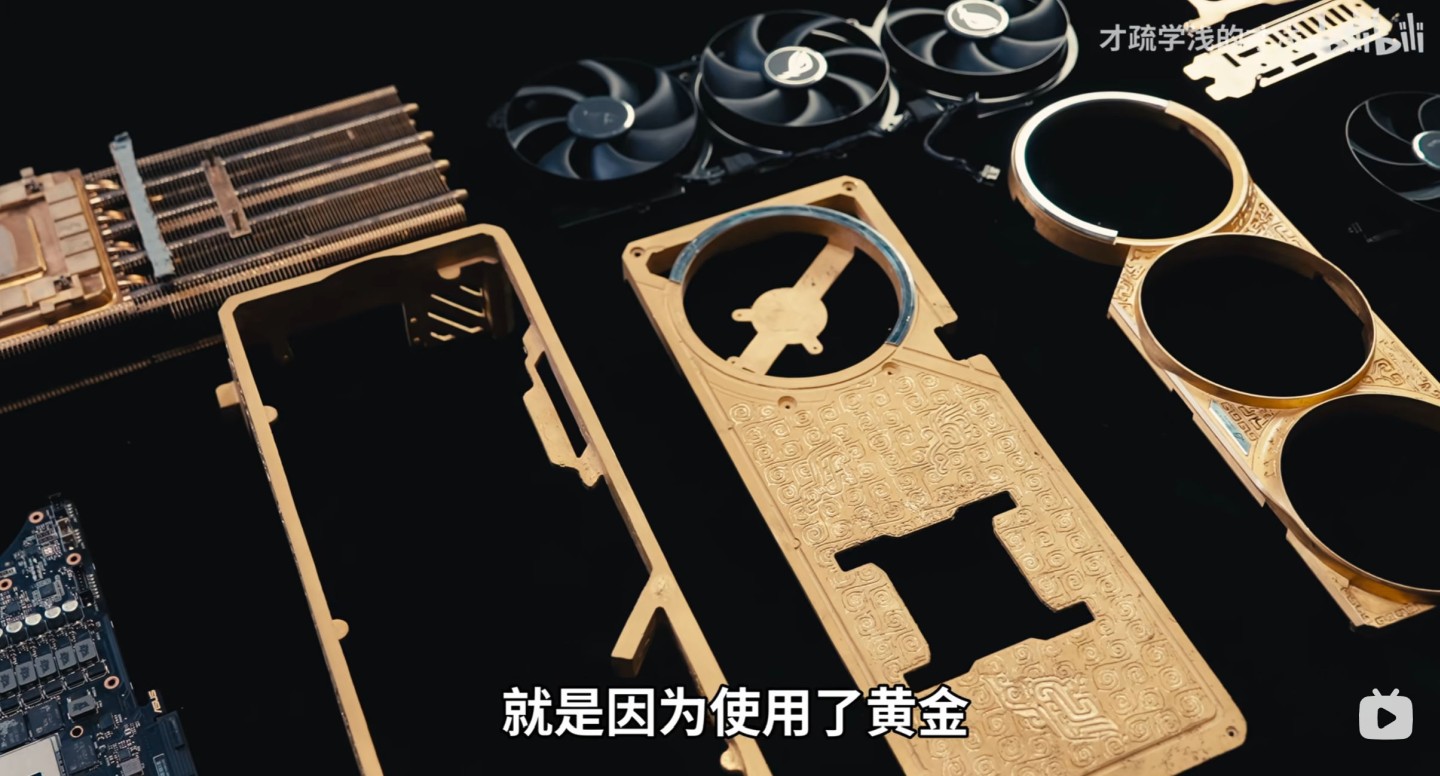 Каждый компонент, включая кожух, заднюю пластину и рамку, отлит и отполирован вручную. Общий вес видеокарты 7,56 кг, из которых 5 кг — это золото. Поверхность сочетает пескоструйную обработку и полировку, есть гравировка с изображением облаков, что символизирует удачу. Все это покрыто эмалью.