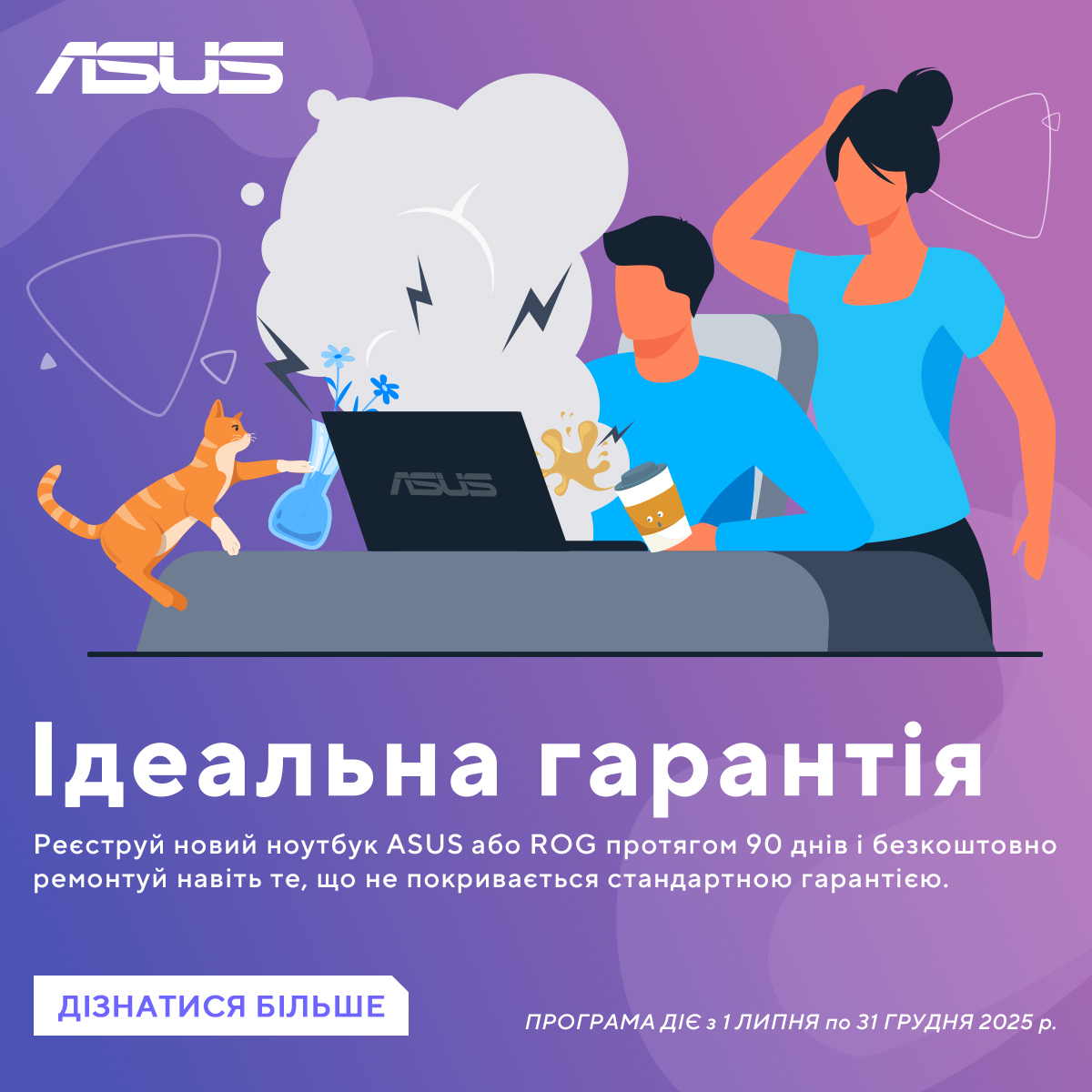 Компания ASUS с радостью представляет уникальную программу для новых владельцев ноутбуков ASUS в Украине. Отныне каждый покупатель, который приобретет ноутбук ASUS и зарегистрирует устройство в течение 90 дней с даты покупки, получает возможность в течение года бесплатно пользоваться дополнительной гарантией ASUS Perfect Warranty. Эта гарантия покрывает ремонт повреждений, на которые не распространяются условия стандартной гарантии ASUS, в частности непреднамеренные повреждения по вине пользователя.