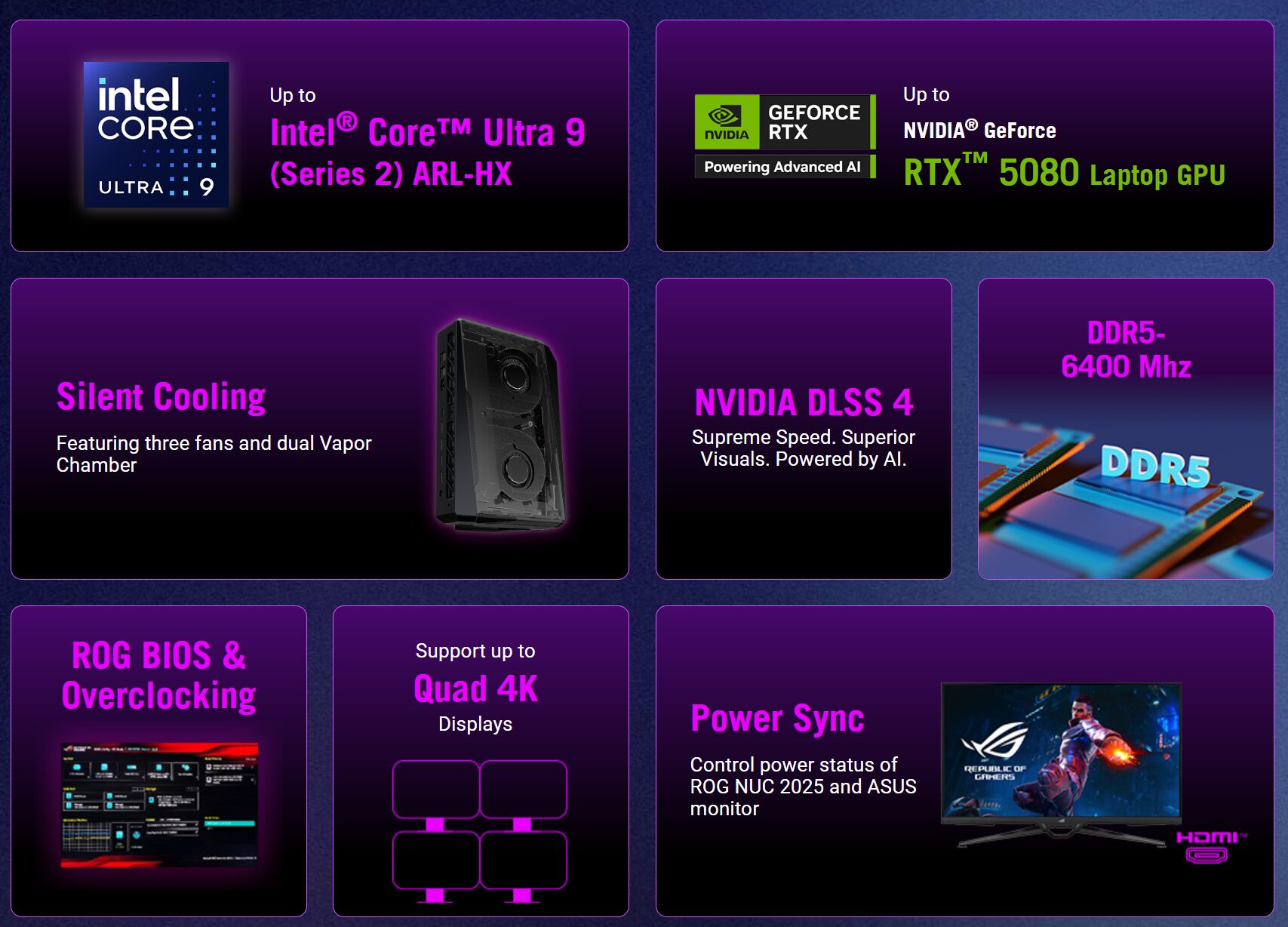 Из особенностей новых ROG NUC также стоит отметить систему охлаждения на базе двух испарительных камер и трёх вентиляторов, поддержку до четырёх 4K-дисплеев, 2,5‑гигабитный Ethernet, порт Thunderbolt 4 и беспроводной модуль Wi-Fi 7. С более детальными характеристиками мини-компьютеров можно ознакомиться на сайте производителя.
