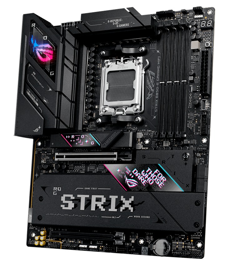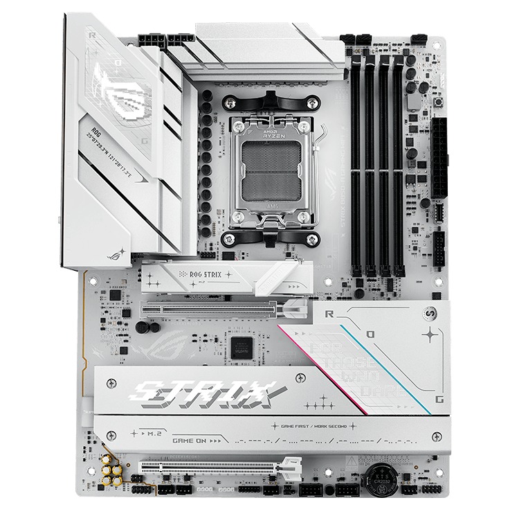 Плата ASUS ROG Strix B850-A Gaming WiFi выполнена в стильном геймерском дизайне и в белом цвете.