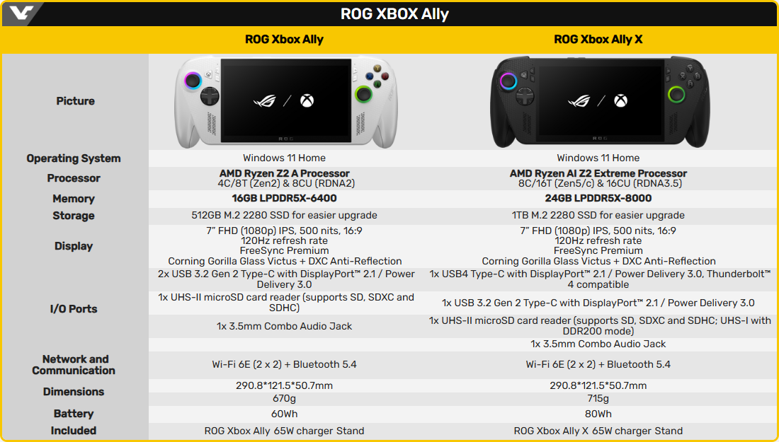 О технических характеристиках новинок мы рассказывали в материале по случаю анонса. Главное отличие между ASUS ROG Xbox Ally и ROG Xbox Ally X кроется в модели процессора: AMD Ryzen Z2 A и Ryzen AI Z2 Extreme соответственно. Старшая модель также может похвалиться 24 гигабайтами памяти LPDDR5X-8000 вместо 16 ГБ LPDDR5X-6400 и более ёмким аккумулятором — 80 Вт·ч против 60 Вт·ч.