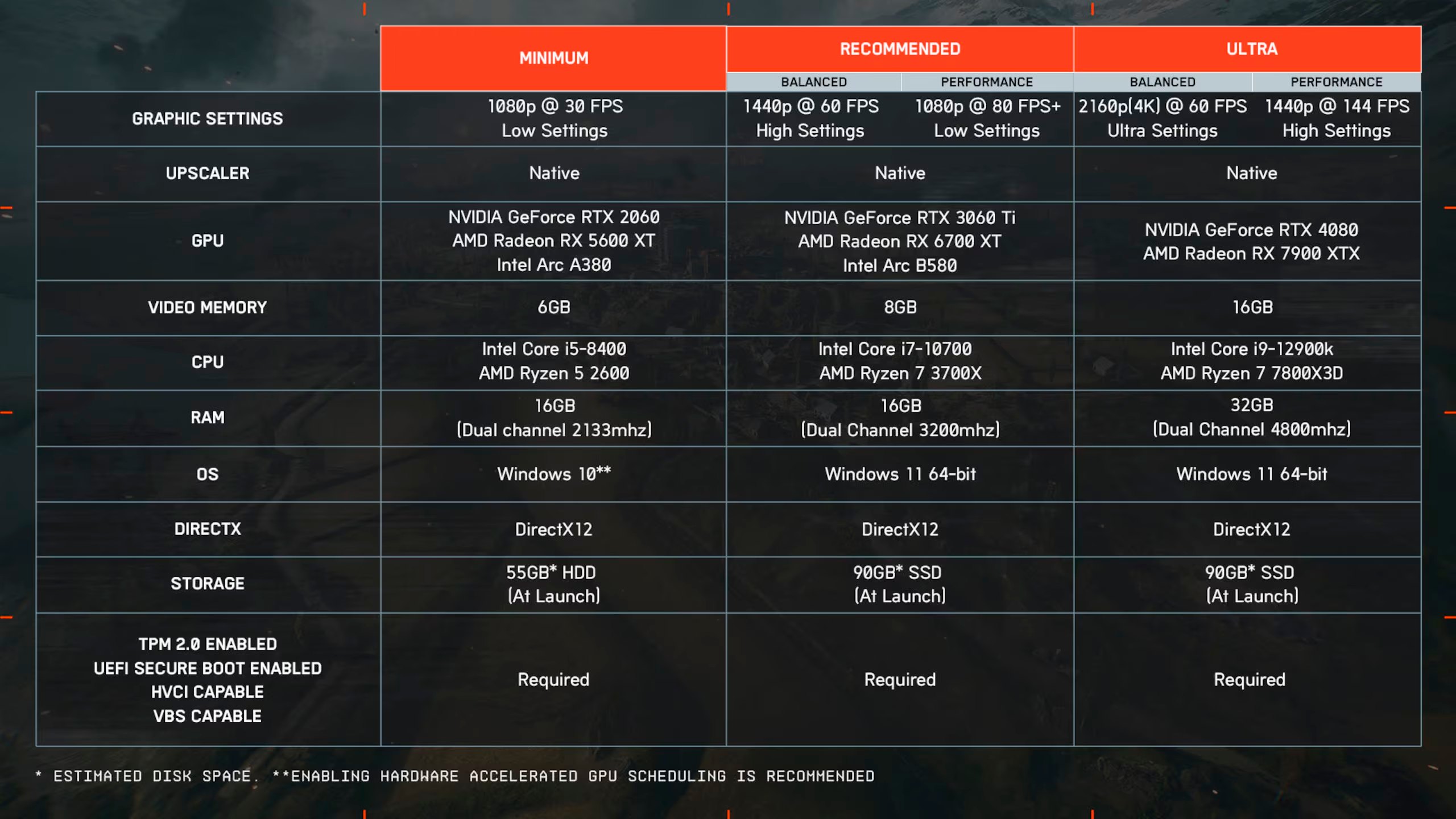 Обновлены системные требования для игры. В минимальных требованиях для 720p указан ПК на базе процессора AMD Ryzen 5 2600 или Intel Core i5-8400, 16 ГБ памяти и видеокарты GeForce RTX 2060, Radeon RX 5600 XT и Intel Arc A380. Для 1080p/1440p рекомендуют систему на базе AMD Ryzen 7 3700X или Intel Core i7-10700, 16 ГБ памяти и видеокарты GeForce RTX 3060 Ti и Radeon RX 6700 XT. Для максимальной графики в 4K при 60 кадрах в секунду рекомендуют AMD Ryzen 7 7800X3D и Intel Core i9-12900K, 32 ГБ памяти, видеокарты GeForce RTX 4080 и Radeon RX 7900 XTX. Указанные конфигурации актуальны для настроек без апскейлинга. Трассировки лучей в Battlefield 6 не будет. На старте игра будет занимать около 90 гигабайт на накопителе.