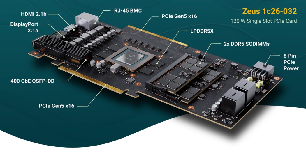 Новый GPU ориентирован на профессиональный сегмент и интенсивные нагрузки. GPU использует ядра на архитектуре RISC‑V RVA23, сопряженные с FP64 ALU, которые обрабатывают данные в 8/16/32/64-битном представлении, а также поддерживает собственные расширения Bolt для научных нагрузок. Чип лишен некоторых классических блоков графического конвейера, включая TMU и ROP, но имеет специальные блоки Glowstick для аппаратной обработки трассировки пути. Теоретический потенциал Zeus в трассировке оценивается в 77 гигалучей для самой простой версии GPU, что обеспечит огромное преимущество относительно существующих решений. И все это при мощности до 120 Вт с одним восьмиконтактным разъемом питания!