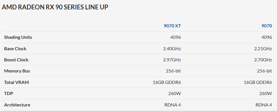 В целом данные ритейлера коррелируют с информацией от других неофициальных источников. Видеокарта Radeon RX 9070 XT получит 4096 потоковых процессоров и 16 гигабайтов памяти GDDR6 с 256-битной шиной, а GPU будет функционировать на частоте от 2,4 до 2,97 ГГц. Штатный показатель TBP у новинки составит 260 Вт.