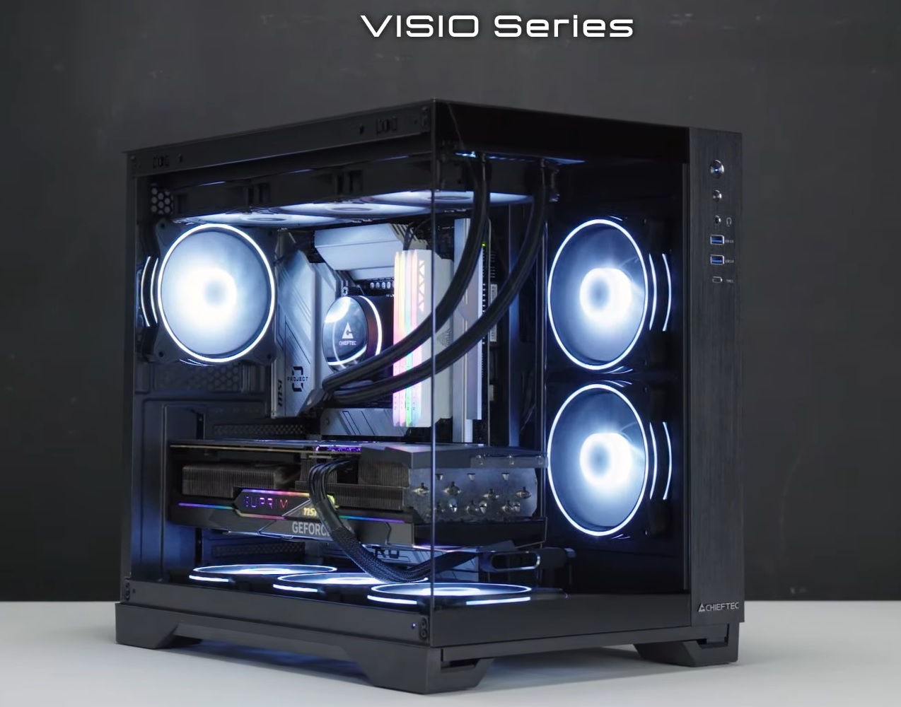 Габариты корпусов Chieftec Visio (Air) составляют 430 x 295 x 390 мм. Внутри есть место для материнской платы формата ATX, пары 2,5- и двух 3,5-дюймовых накопителей, ATX-совместимого источника питания и шести карт расширения длиной до 410 мм. Поддерживаются воздушные CPU-кулеры высотой до 175 мм, предусмотрена возможность установки 280-/360-мм радиаторов системы жидкостного охлаждения.