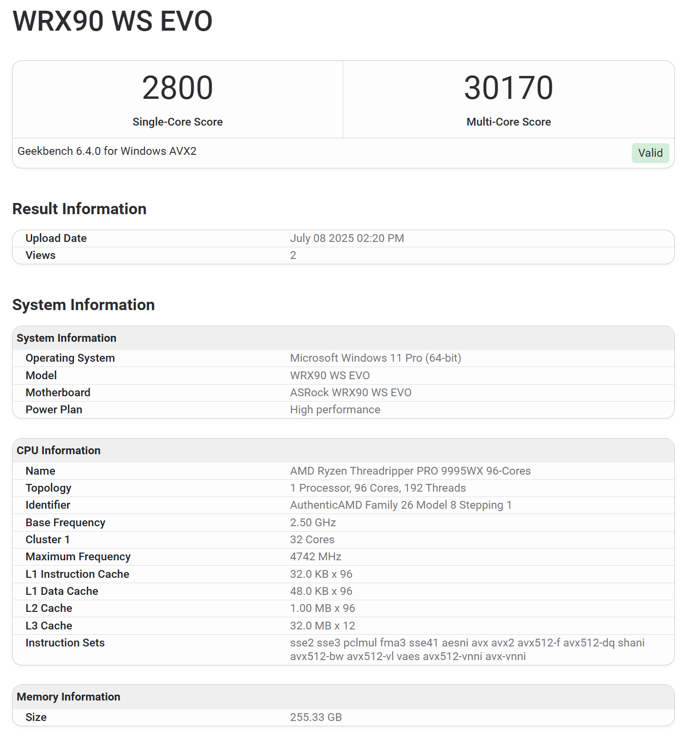 AMD Ryzen Threadripper PRO 9995WX также успел «засветиться» в онлайн-базе тестового пакета Geekbench. Он был протестирован на материнской плате ASRock WRX90 WS EVO с 256 гигабайтами оперативной памяти. Результат новики составил 2800/30 170 баллов (Single-/Multi-Core). Если сравнивать с Ryzen Threadripper Pro 7995WX, то однопоточный результат остался на уровне предшественника, зато многопоточная производительность выросла на 22%.