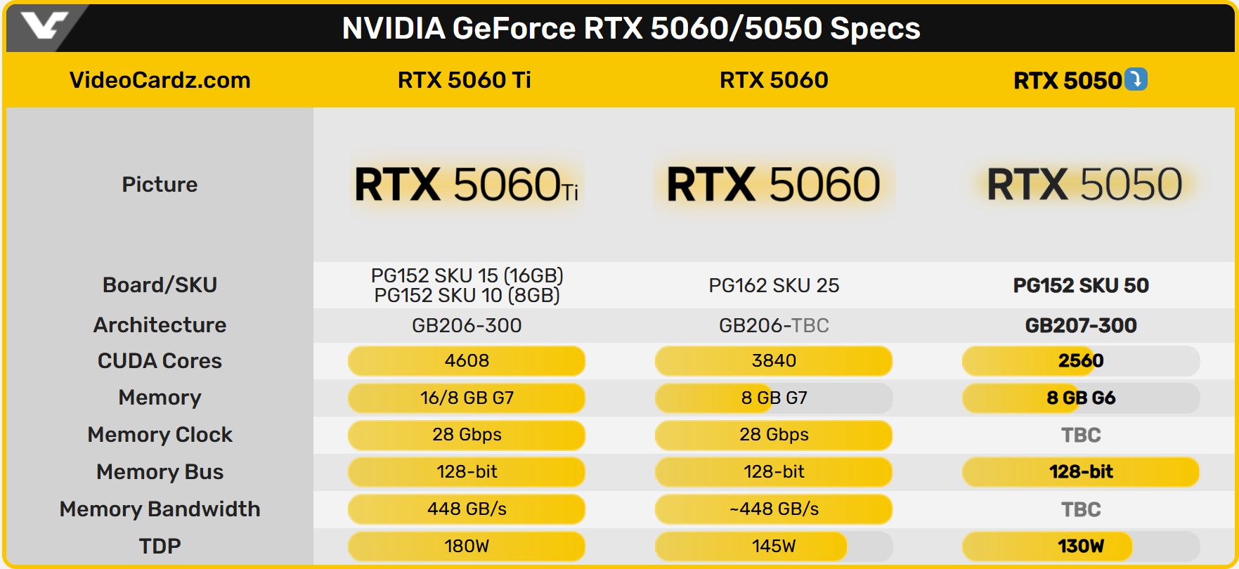 Ранее поступала информация, что «сердцем» GeForce RTX 5050 выступит графический процессор NVIDIA GB207 в конфигурации с 2560 ядрами CUDA и 128-разрядной шиной памяти, через которую GPU будет взаимодействовать с 8‑гигабайтным видеобуфером. Использование чипов GDDR6 означает, что пропускная способность памяти у новинки будет существенно ниже, чем у карт серии GeForce RTX 5060, оборудованных GDDR7.