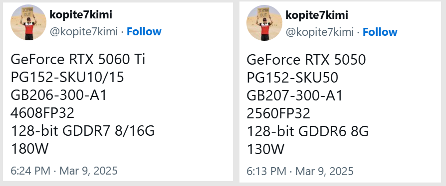 В Сети появилась свежая информация относительно спецификаций младших видеокарт GeForce RTX 50-й серии на базе архитектуры Nvidia Blackwell. Речь идёт о моделях GeForce RTX 5060 (Ti) и RTX 5050, основные параметры которых опубликовал известный энтузиаст kopite7kimi. В прошлом он не раз делился точными сведениями о будущих GPU Nvidia, но мы, как обычно, рекомендуем относиться к предоставленной информации со здравым скептицизмом.