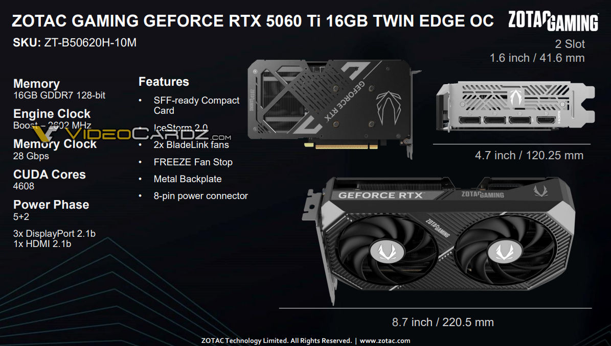 Спецификации GeForce RTX 5060 Ti не станут сюрпризом для наших постоянных читателей. Видеокарта получила 4608 ядер CUDA, 128-разрядную шину памяти и 8 или 16 гигабайтов GDDR7 со скоростью 28 Гбит/с. Для новинок Zotac характерна boost-частота графического процессора от 2572 до 2632 МГц, а пропускная способность видеобуфера составляет 448 Гбайт/с.