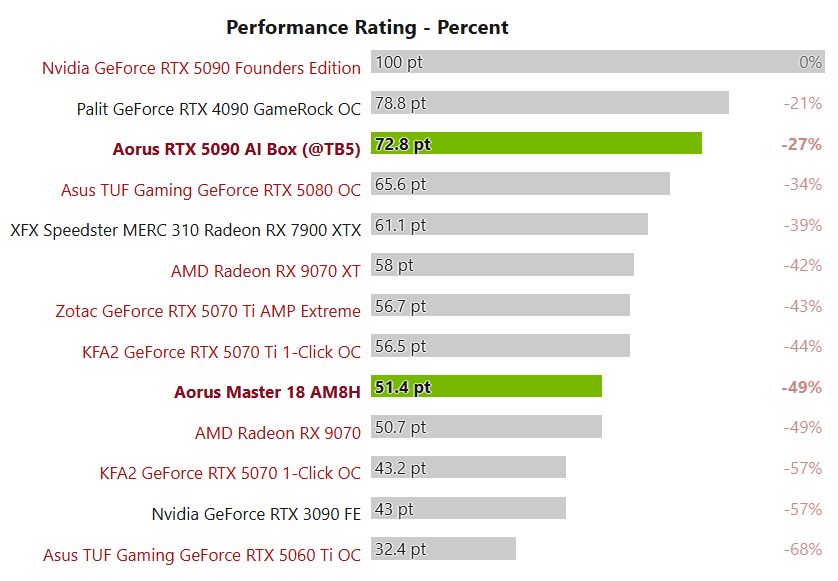 В независимых бенчмарках Aorus RTX 5090 AI Box показала весьма неплохую производительность, но всё-таки уступает GeForce RTX 5090, установленной в слот PCI Express 5.0 x16. Например, в играх она оказалась на 27% медленнее. Здесь следует добавить, что Aorus RTX 5090 AI Box была испытана вместе с ноутбуком Aorus Master 18 AM8H на базе Intel Core Ultra 9 275HX, а замеры быстродействия GeForce RTX 5090 проводились на ПК с чипом AMD Ryzen 7 9800X3D.