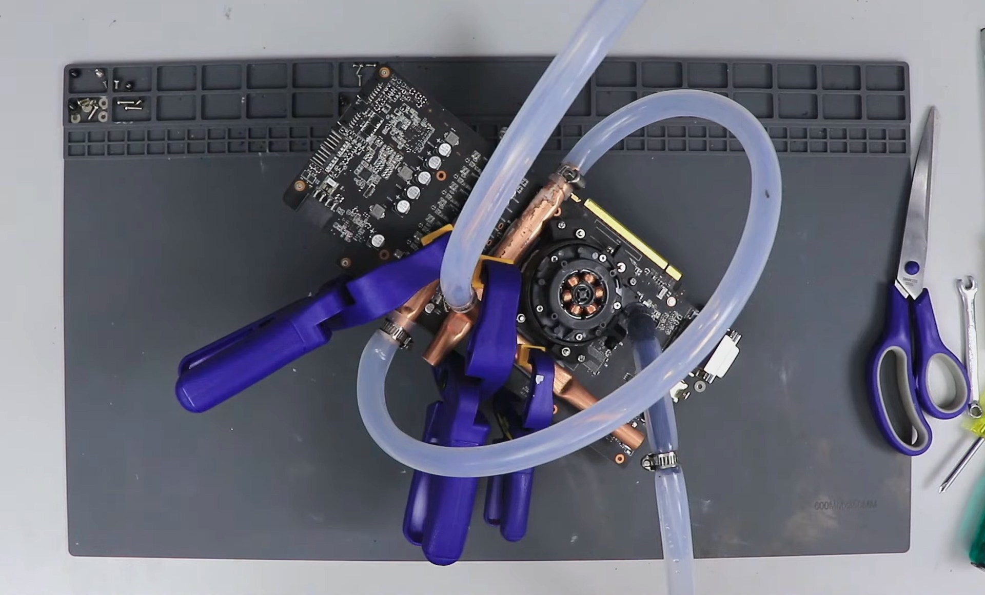 Самой интересной частью эксперимента является самодельное охлаждение. Эстетика тут была отодвинута на второй план. Моддер использовал медные трубки из строительного магазина, сплющил их и установил на микросхемы памяти и силовые компоненты, потом подключил к ним шланги для циркуляции жидкости. На графический блок сразу установлен водоблок с помпой.