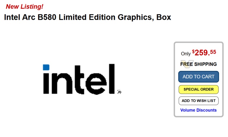 По последней информации, в зарубежных магазинах видеокарту Intel Arc B580 можно будет приобрести по цене от 250 долларов. Более того, один из североамериканских ритейлеров уже предлагает приобрести новинку примерно за $260. Речь идёт о модели Arc B580 Limited Edition, выполненной в эталонном дизайне Intel. Изображения видеокарты, к сожалению, опубликованы не были, но в поколении Alchemist такие видеокарты оснащались кулером с двумя вентиляторами.