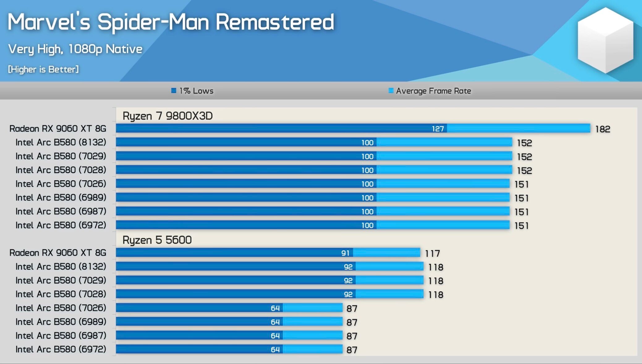 В качестве примера редакция Hardware Unboxed приводит Marvel’s Spider Man Remastered. В этой игре Arc B580 при работе с процессором Ryzen 5 5600 значительно отставала от Radeon RX 9060 XT, но с более свежим драйвером производительность обеих видеокарт находится на одном уровне. Правда, узким местом системы в такой конфигурации выступает сам центральный процессор.