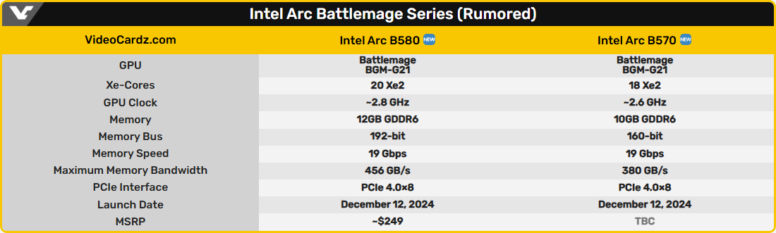 По имеющейся информации, во вторник Intel представит две видеокарты: Arc B570 и B580. В продажу новинки поступят 12 декабря, тогда же будут опубликованы первые обзоры. Речь идёт о моделях эталонного дизайна Intel Limited Edition. Версии от AIB-партнёров чипмейкера выйдут несколько позже, а посвящённые им материалы начнут появляться в Сети начиная с 13 декабря. С предварительными характеристиками новинок можно ознакомиться в таблице ниже.