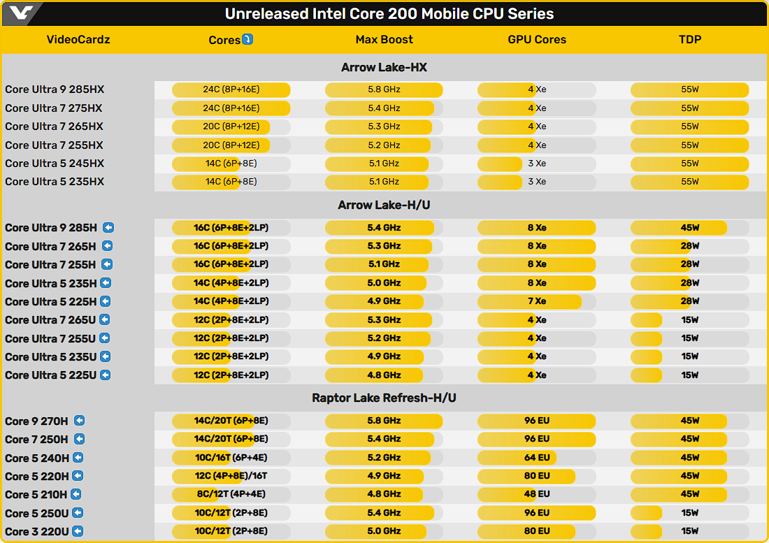 Согласно предоставленной информации, Intel готовит к выпуску несколько десятков моделей процессоров для ноутбуков. Семейство Arrow Lake-HX рассчитано на топовые игровые ноутбуки или мобильные рабочие станции и, грубо говоря, представлено десктопными Core Ultra 200-й серии в BGA-исполнении.