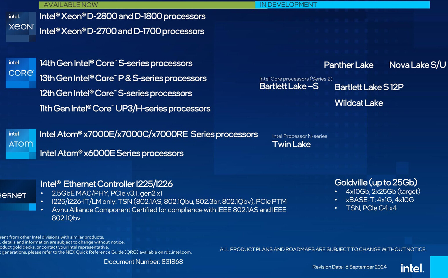 Корпорация Intel упомянула процессоры Nova Lake в своих официальных материалах. В Сети появился слайд чипмейкера, на котором раскрываются планы по развитию ассортимента CPU на ближайшие годы. Речь идёт о процессорах с поддержкой технологий Intel Time Coordinated Computing (TCC), то есть здесь указывается лишь часть будущих продуктов компании. Также отметим, что данные на слайде приведены по состоянию на сентябрь 2024-го.