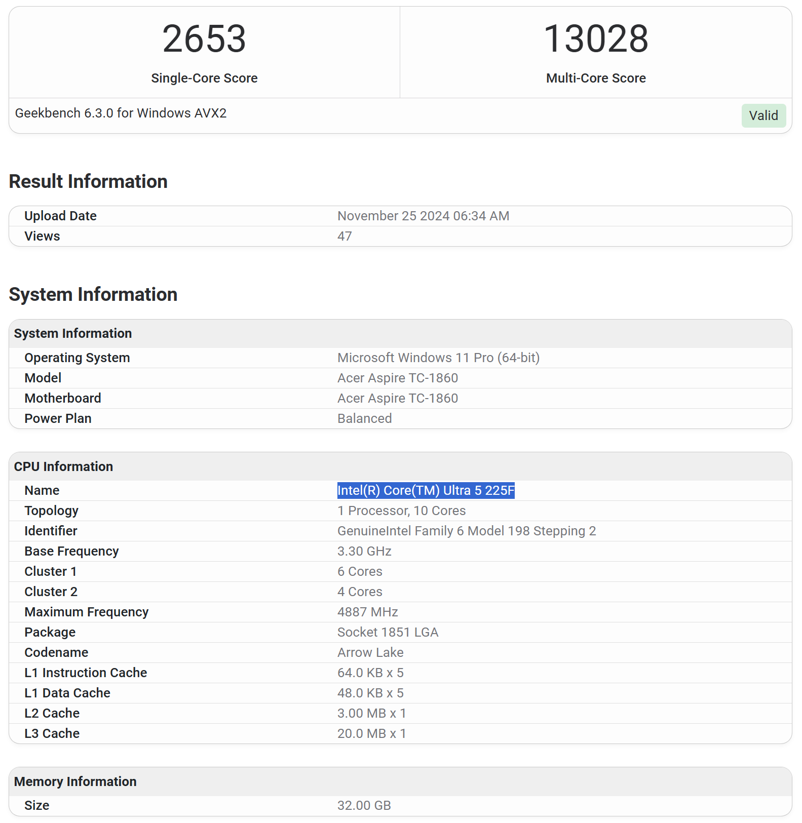 Корпорация Intel активно готовится к релизу новых моделей процессоров Core Ultra 200 (Arrow Lake-S) для настольных компьютеров. Образцы будущих CPU LGA1851 уже тестируются как самим чипмейкером, так и его партнёрами. Один из таких процессоров — Core Ultra 5 225F — накануне отметился в базе данных тестового пакета Geekbench.