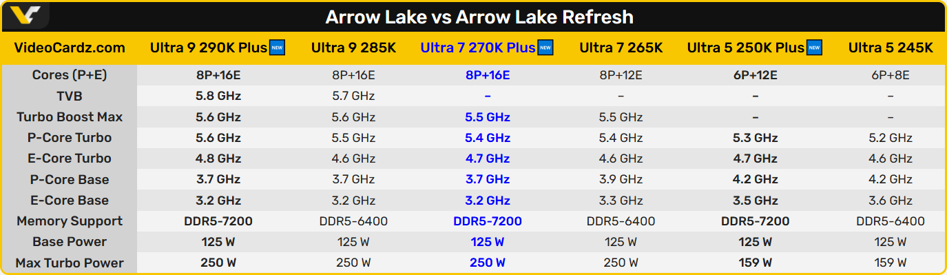 Как и ожидалось, процессор Intel Core Ultra 7 270K Plus на фоне предшественника (Core Ultra 7 265K) будет выделяться четырьмя дополнительными E‑ядрами. То есть новинка догонит чипы серии Core Ultra 9, правда, будет работать на немного меньших частотах. Ещё одним нововведением чипов Arrow Lake‑S Refresh станет штатная поддержка оперативной памяти DDR5-7200 против DDR5-6400 у выпущенных ранее процессоров.