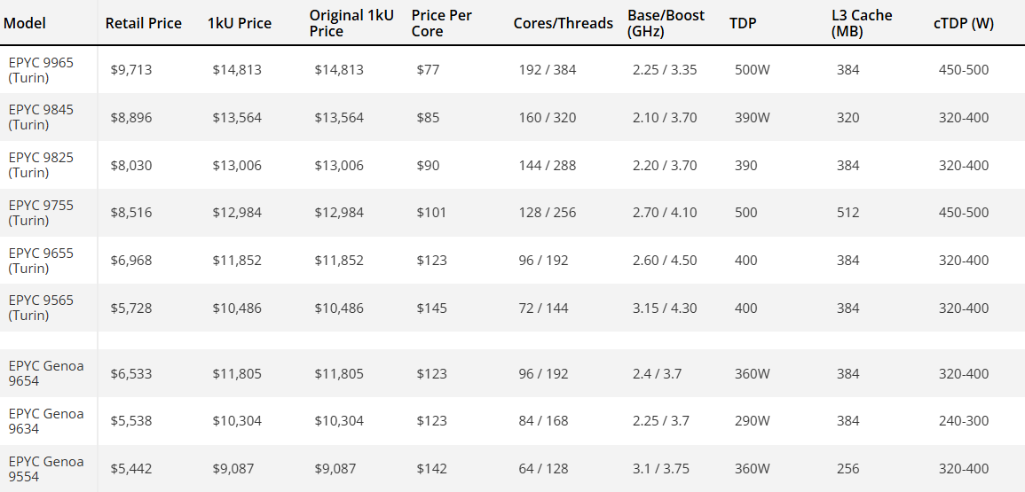 Редакция Tom’s Hardware отмечает, что в настоящее время серверные процессоры Intel и AMD можно приобрести существенно дешевле их рекомендованной цены. В частности, флагманский 192-ядерник EPYC 9965 с архитектурой Zen 5c «красные» официально оценивают в $14 813, но в настоящее время его можно приобрести за 9 713 долларов. Аналогичная ситуация наблюдается и в случае других моделей CPU Turin и Genoa.