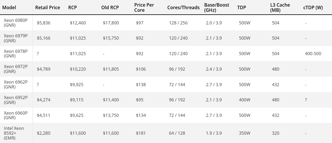 В это же время Intel пришлось дополнительно снизить цены на процессоры линейки Xeon 6900P (Granite Rapids), в результате чего некоторые модели сейчас предлагаются примерно за треть от оригинальной цены. Например, флагманский Xeon 6980P (128 ядер/256 потоков) на момент релиза осенью 2024-го официально стоил 17,8 тысячи долларов, в январе он подешевел до $12 460, а ныне он доступен в зарубежных магазинах по цене от $5 836.