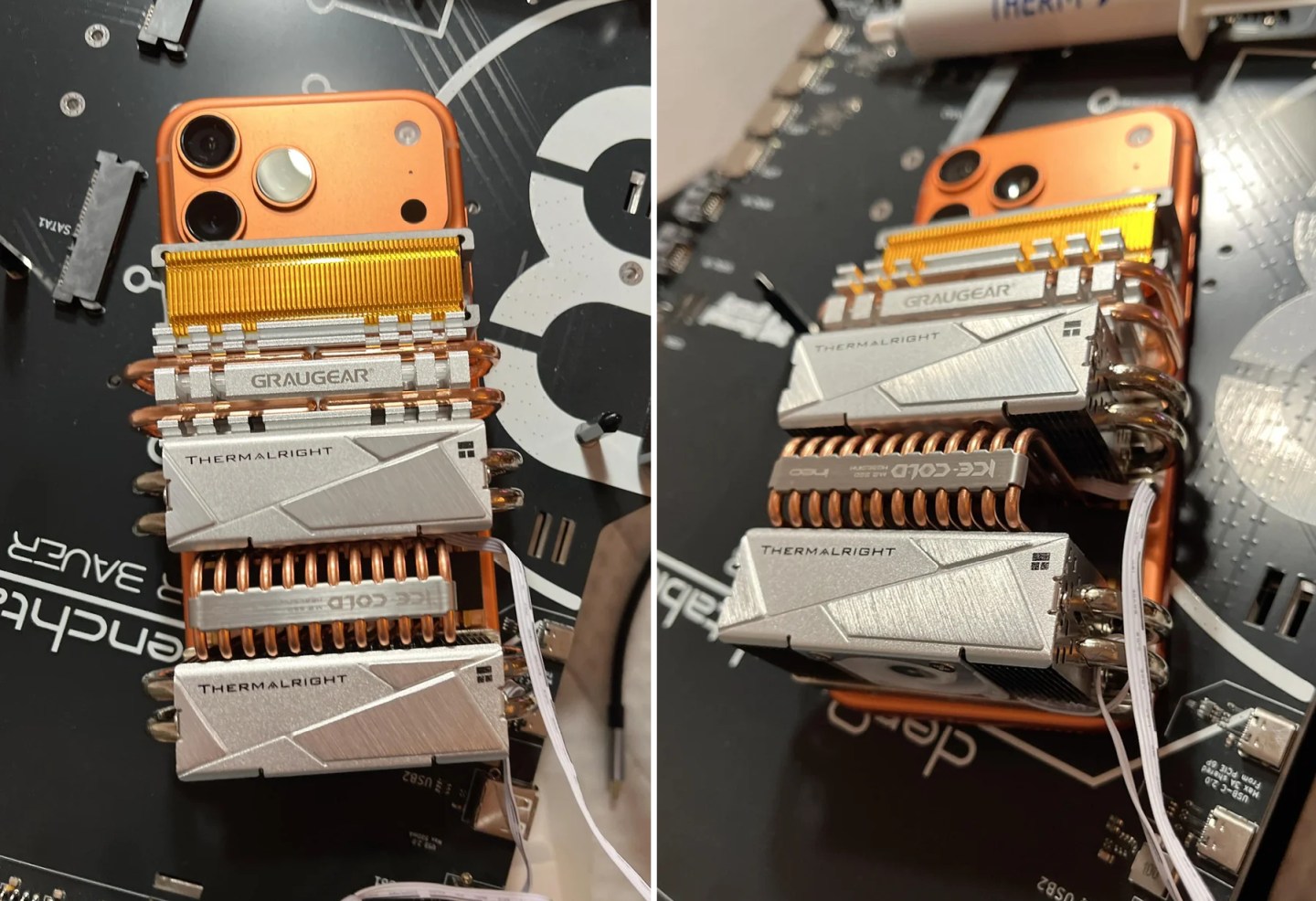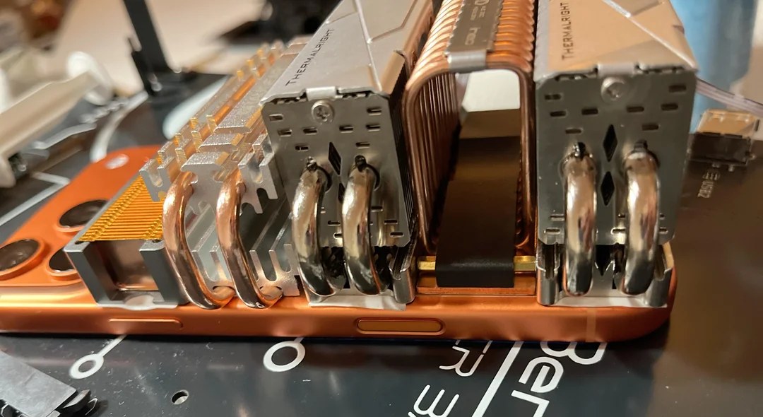 Он установил на корпус телефона пять больших систем охлаждения от производительных SSD PCIe NVMe Gen 5. И это не простые радиаторы, а системы с тепловыми трубками, у одного даже есть вентилятор. Так что выглядит все это монструозно и забавно.