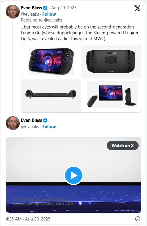 Компания Lenovo готовится к старту продаж портативной игровой системы Legion Go 2. По последней информации, официальный релиз устройства состоится в рамках выставки IFA 2025, которая пройдёт в Берлине с 5 по 9 сентября. Добавим, что ранее производитель выпустил модель Legion Go S, которая доступна в версиях под управлением как Windows 11, так и SteamOS.