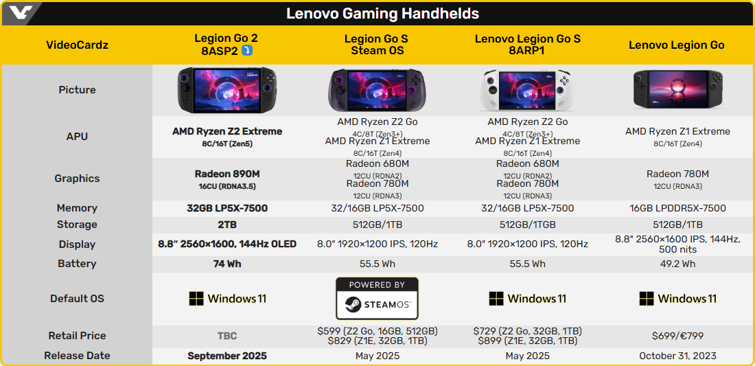 Как и предшественница, Legion Go 2 сохранит дизайн со съёмными контроллерами по бокам. Ранее в Китае были замечены прототипы устройства, правда, в них использовался менее производительный AMD Ryzen Z2, который фактически является переименованным Ryzen Z1 Extreme. Сравнить характеристики портативных игровых систем Lenovo можно ниже. Рекомендованная цена Legion Go 2 на данный момент остаётся неизвестной.