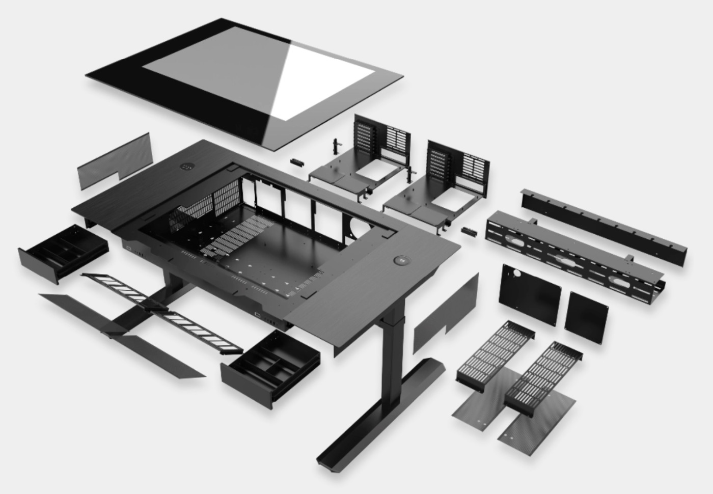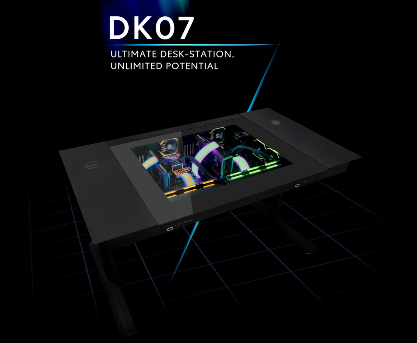 Компания Lian Li выпустила на рынок моторизированный стол DK07, в котором можно собрать один или даже два ПК. Он предлагает большое пространство и эффективное управление кабелями, избавляя от корпуса под ногами и лишних проводов. И все это выполнено в формате стильного рабочего стола из стали и алюминия с большим закаленным стеклом на поверхности столешницы. Встроенные электрические приводы позволяют плавно регулировать высоту.