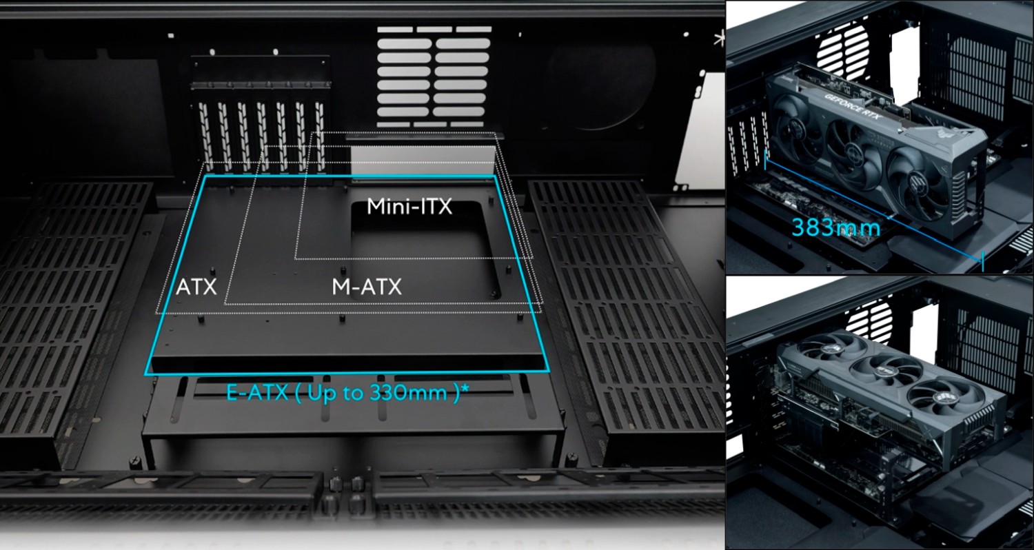 Внутреннее пространство позволяет разметить две полноценные системы. Поддерживаются материнские платы формата E-ATX, ATX, Micro-ATX и MiniI-ITX. Возможна установка видеокарт длиной до 383 мм и процессорных кулеров высотой до 180 мм. При сборке предусмотрен традиционный монтаж графического ускорителя, но есть и возможность вертикальной установки через райзер. Специальный кабельный лоток, липучки и зажимы позволяют аккуратно уложить все кабели внутри и снаружи.