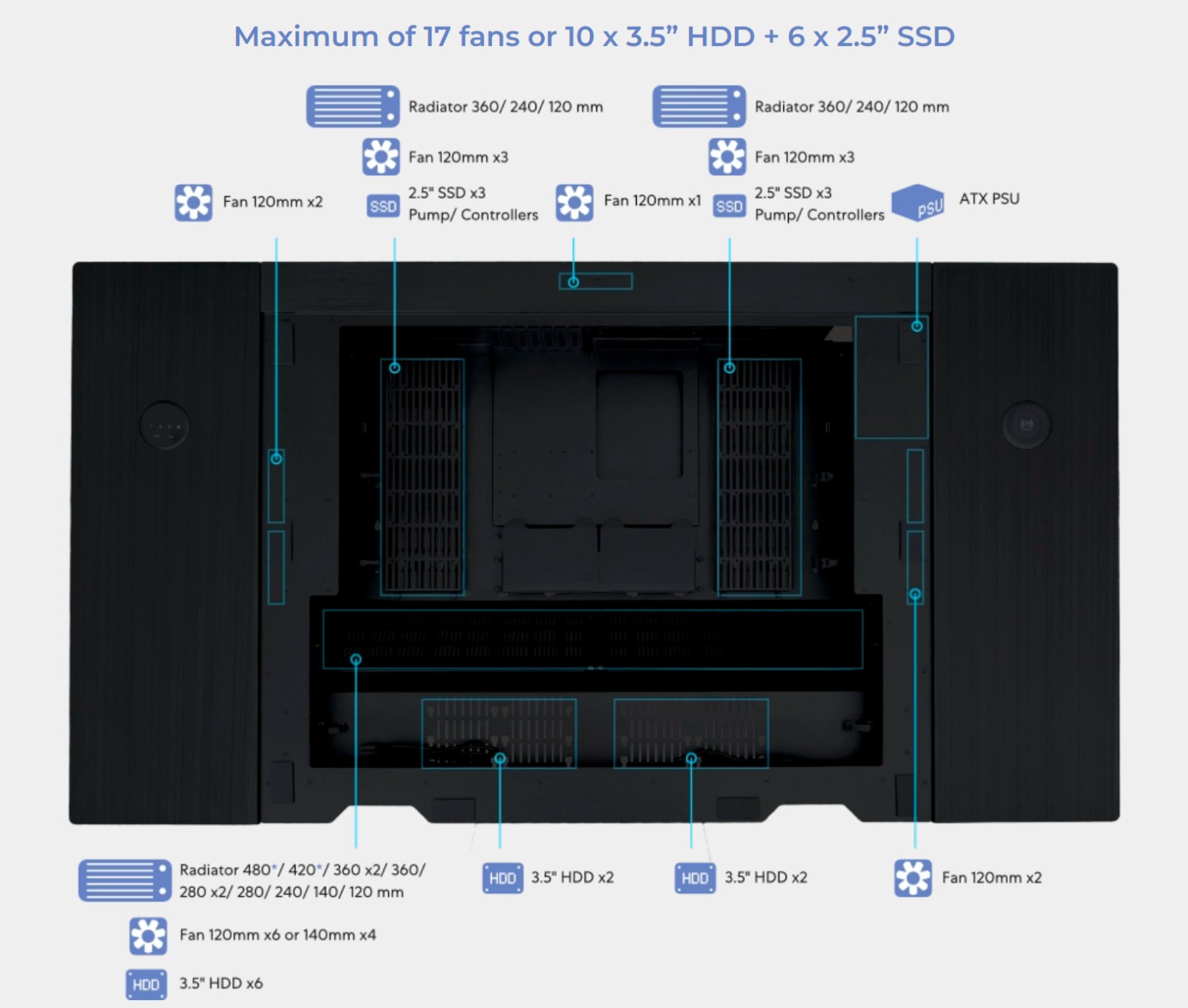 Предусмотрена возможность установки большого количества вентиляторов и накопителей. При одной системе это максимум до 17 вентиляторов 120 мм или 10 HDD 3,5” + 6 SSD 2,5”.