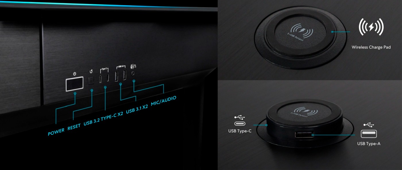 Для каждого ПК есть своя передняя панель, куда выведено по два USB 3.2 Type-C и два USB 3.1 Type-A. В стол встроен блок беспроводной зарядки с выдвижным механизмом, который открывает доступ к дополнительным портам USB Type-C.