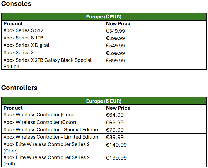 Повышение рекомендованных цен затронет как сами игровые консоли Xbox Series X/S, так и аксессуары к ним. К примеру, в Европе все доступные варианты приставок подорожали на 50 евро. За базовую версию Xbox Series S, оборудованную 512-гигабайтным хранилищем, теперь придётся выложить €349,99 вместо €299,99, а «цифровой» вариант Xbox Series X, лишённый привода Blu-ray, стоит €549,99 вместо €499,99. Более подробная информация приведена на официальном сайте Microsoft.