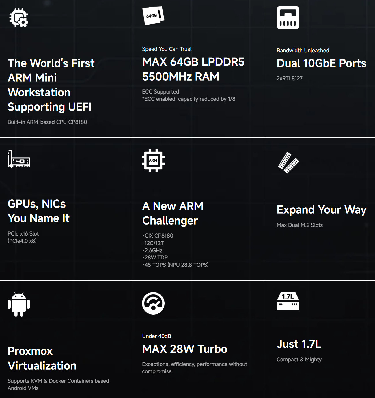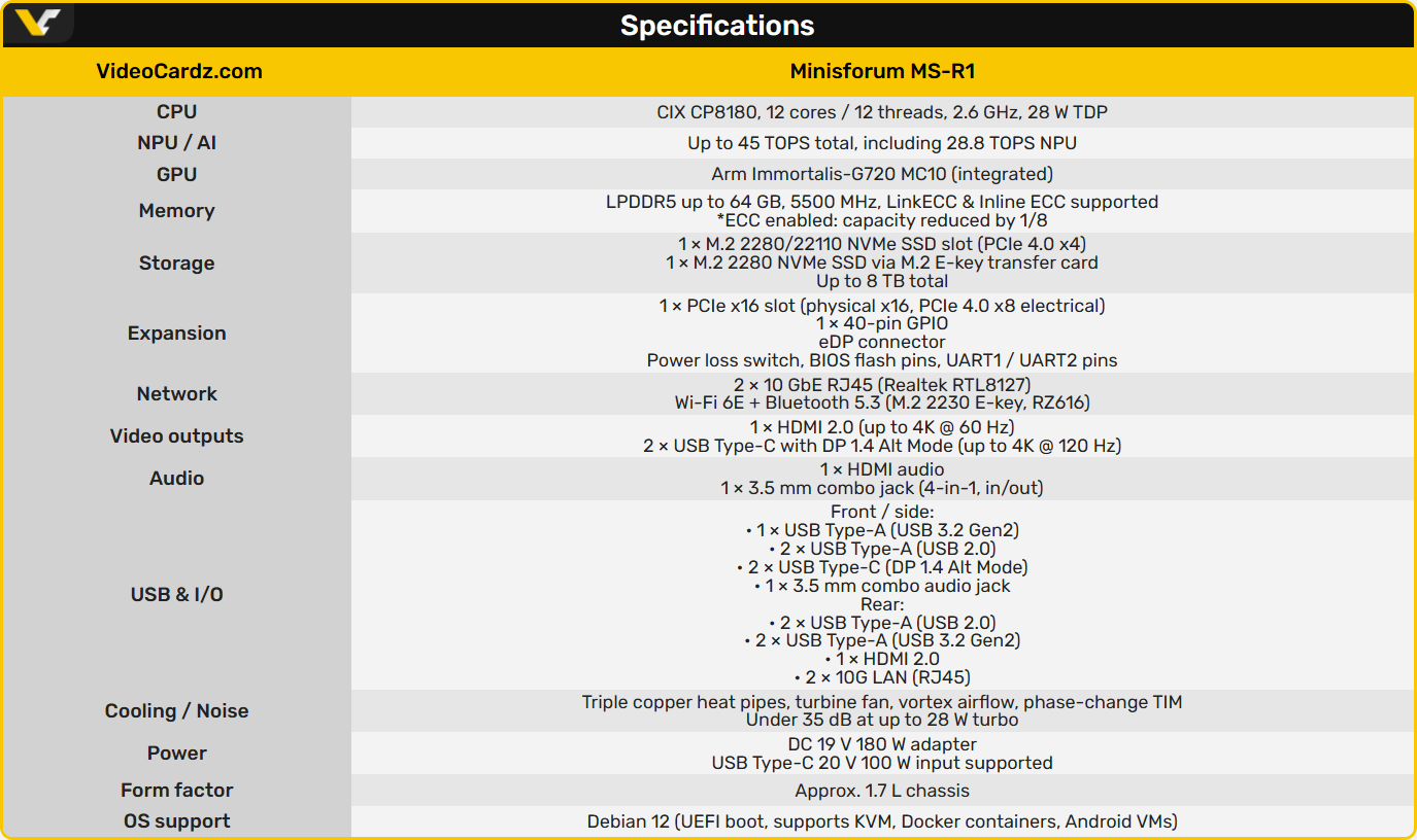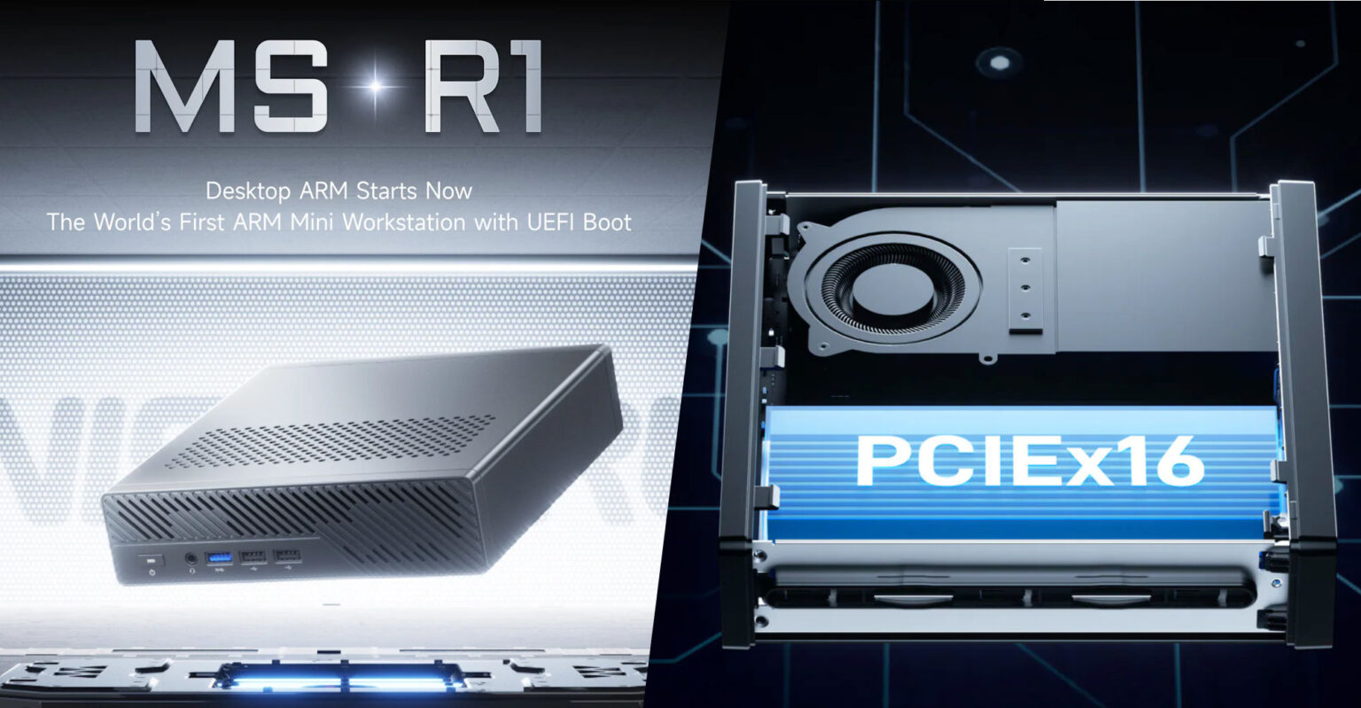 Гонконгская фирма Minisforum дополнила и без того богатый ассортимент мини-компьютеров первой моделью на базе архитектуры ARM. В MS-R1 компания применила 28-ваттную однокристальную систему CIX CP8180 с 12 вычислительными ядрами (восемь Cortex-A720 и четыре Cortex‑A520), встроенной графикой Immortalis-G720 MC10 и NPU-блоком производительностью 28,8 TOPS. Устройство позиционируется как рабочая станция с поддержкой UEFI Boot.