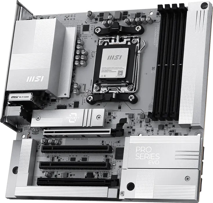 Из оснащения MSI Pro B840M‑P Evo WiFi6E PZ можно выделить (7+2+1)-фазную систему питания, четыре разъёма под модули оперативной памяти DDR5, слоты расширения PCI Express 4.0 x16 и три PCIe 3.0 x16 (в режиме x1/x1/x4). Для накопителей предусмотрено четыре порта SATA 6 Гбит/с и три разъёма M.2, а именно два с поддержкой PCIe 4.0 x4 и один PCIe 3.0 x2 Сетевые возможности представлены беспроводным модулем Wi-Fi 6E и 2,5‑гигабитным Ethernet.