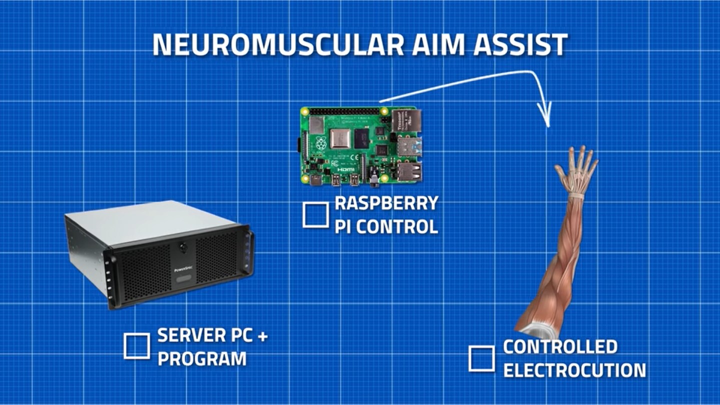 Для реализации такой системы нужен компьютер с программой автоматического определения врагов на экране, система с электродами, которая будет посылать импульсы к мышцам руки и компьютер для управления. Последний был реализован на базе одноплатной системы Raspberry Pi. Первые испытания показали, что воздействие электрическими импульсами на мышцы ускоряет реакцию от появления объекта на экране до нажатия с 200 мс по 100 мс. Но это не означает точность при стрельбе. Также воздействие электричеством было весьма болезненным, из-за постоянного болевого воздействия контролировать себя в игре становится сложнее.