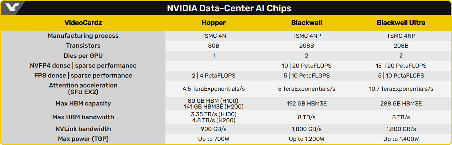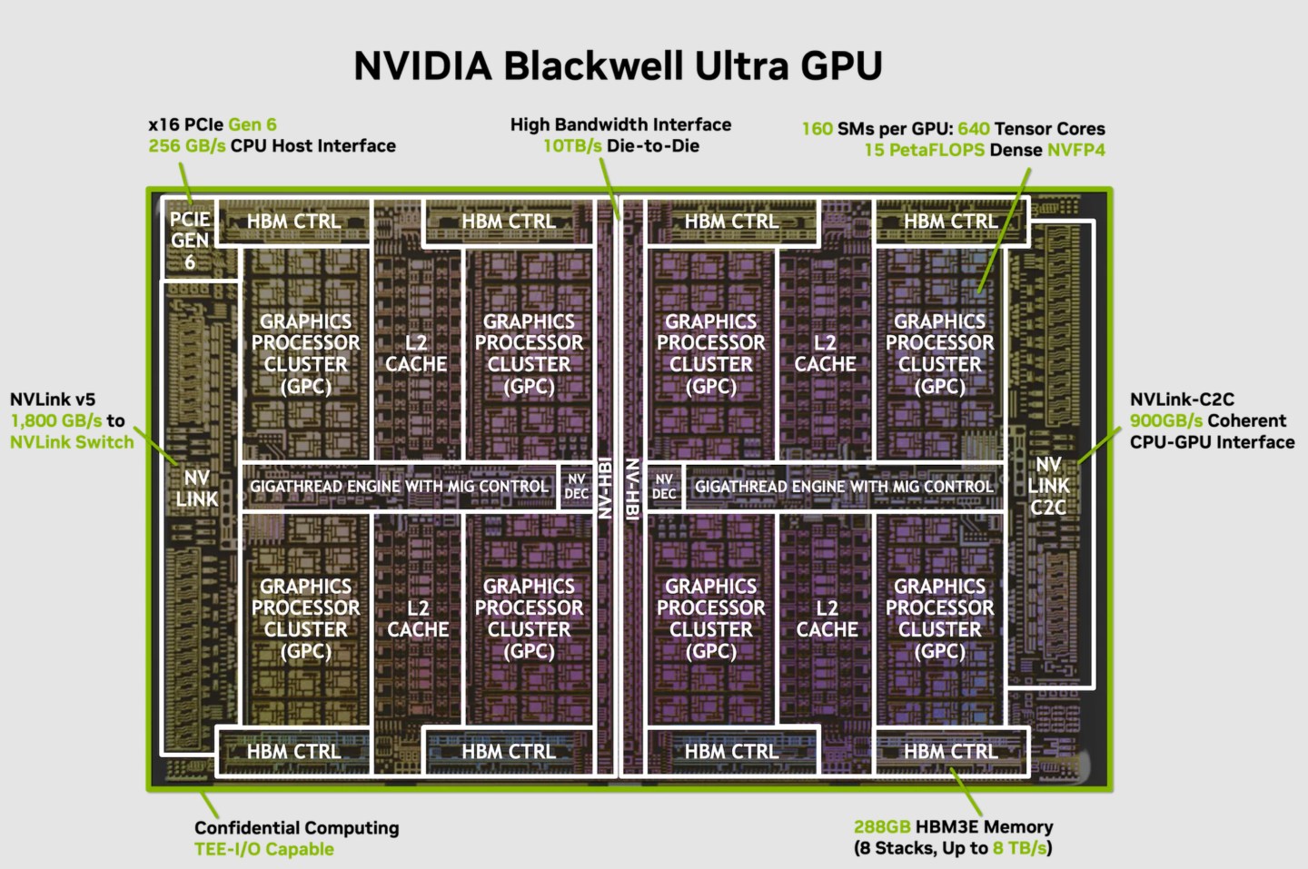 Чип использует два кристалла GPU, которые объединены интерфейсом NV-HBI со скоростью 10 ТБ/с. Весь чип насчитывает примерно 2088 миллиардов транзисторов. Каждый из двух кристаллов GPU насчитывает 160 SM по 128 ядер CUDA в каждом. То есть у одного кристалла всего 20480 ядер CUDA вместо 18432 у первой версии Blackwell. Графический процессор оснащен тензорными ядрами пятого поколения с поддержкой вычислений в формате FP8, FP6 и в новом формате NVFP4. У каждого SM по 256 КБ тензорной памяти и 40 МБ тензорной памяти на кристалл. Также есть дополнительные блоки для специальных математических функций. Память набрана восемью стеками HBM3E общим объемом 288 ГБ (у первой версии Blackwell было 192 ГБ). Пропускная способность памяти осталась на прежнем уровне 8 ТБ/с. Пиковая производительность чипа Blackwell Ultra достигнет 15 PetaFLOPS в режиме NVFP4 вместо 10 PetaFLOPS у Blackwell первого поколения. Параметр энергопотребления TGP повышен до 1400 Вт.