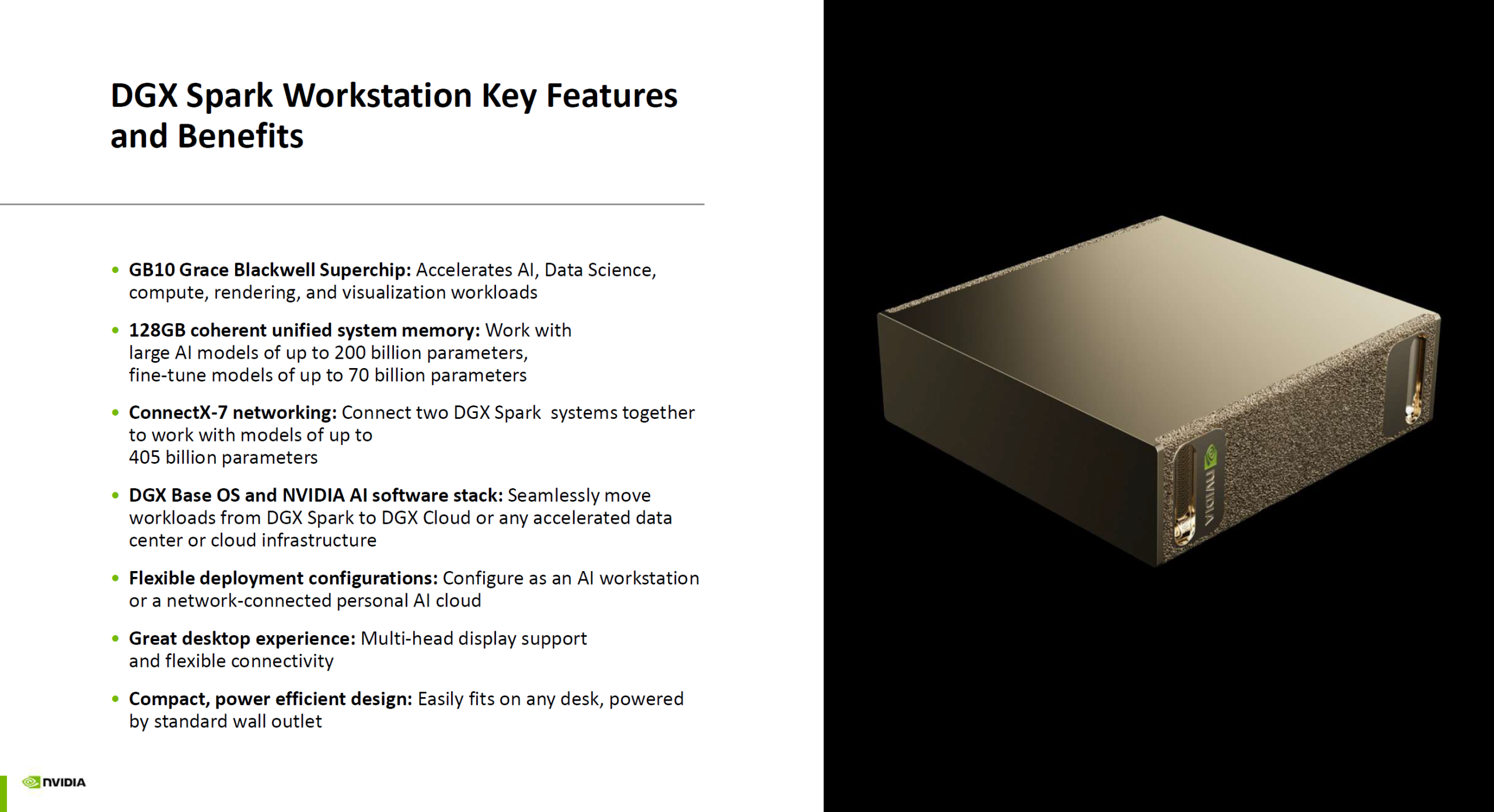 Из других особенностей платформы можно выделить 256-битный контроллер памяти LPDDR5X-9400 с теоретической пропускной способностью около 301 Гбайт/с, поддержку PCI Express 5.0 и возможность одновременной работы с четырьмя дисплеями, в том числе с разрешением до 8K при 120 Гц. Кроме того, предусмотрена возможность объединения рабочих станций на базе GB10 Superchip с помощью технологии NVIDIA ConnectX.