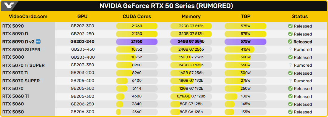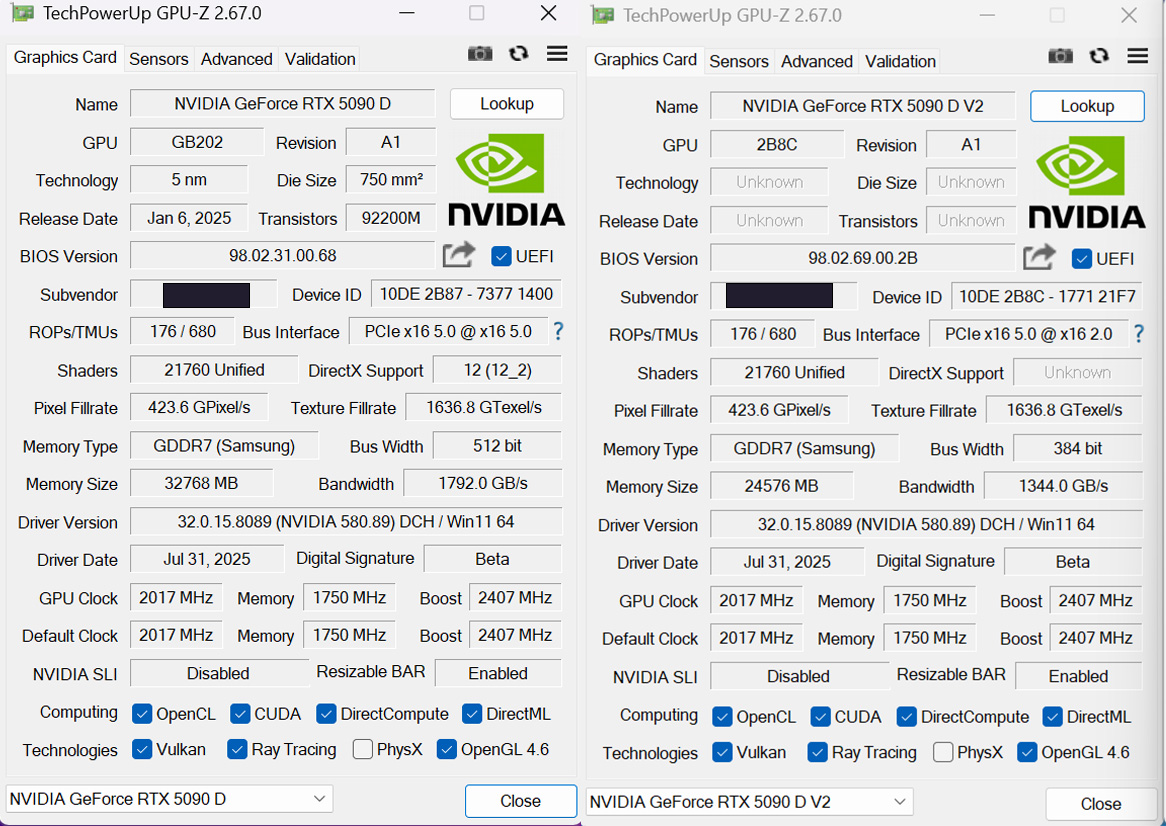 Обновлённая GeForce RTX 5090D получила незамысловатое название GeForce RTX 5090D V2. В арсенале новой видеокарты есть 21760 ядер CUDA, 384-разрядная шина памяти и 24 гигабайта GDDR7. Пропускная способность видеобуфера составит 1344 ГБ/с против 1792 ГБ/с у полноценной 32-гигабайтной GeForce RTX 5090. Интересно, что паспортный уровень TBP остался прежним — 575 Вт.