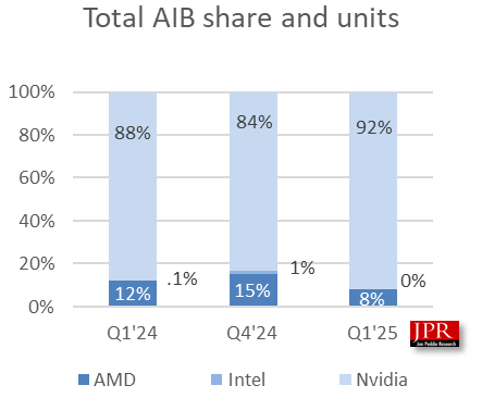 Лидером рынка остаётся компания NVIDIA, причём в первом квартале ей удалось укрепить свои позиции, дополнительно потеснив Intel и AMD. Около 92% всех видеокарт, проданных в январе-марте, использовали «зелёные» графические процессоры. В это же время рыночная доля AMD опустилась примерно до 8%, а показатель Intel упал практически до нуля. И это несмотря на выпуск, казалось бы, «народных» 3D-ускорителей Arc Battlemage.