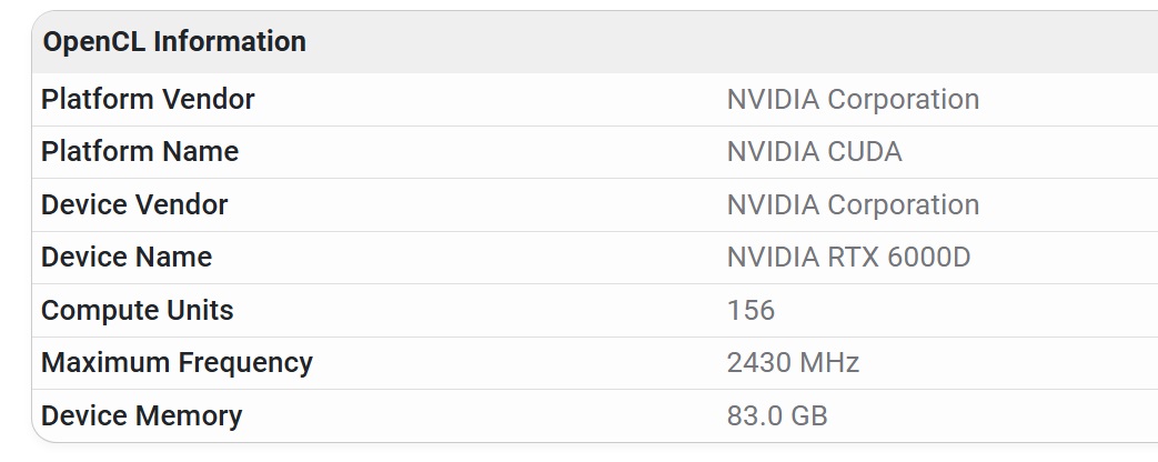 По данным Geekbench, видеокарта NVIDIA RTX 6000D получит 156 модулей SM (Streaming Multiprocessors), что соответствует 19968 ядрам CUDA, а также 84 гигабайта памяти GDDR7. Судя по всему, новинка получит 448-разрядную шину памяти. При условии использования микросхем со скоростью 28 Гбит/с это обеспечит пропускную способность около 1568 Гбайт/с против 1792 Гбайт/с у полноценной RTX Pro 6000.