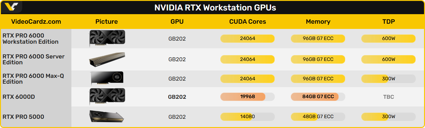 Сравнить характеристики RTX 6000D и других профессиональных видеокарт NVIDIA Blackwell можно в таблице ниже. Добавим, что на фоне ужесточения экспортных ограничений Соединённых Штатов «зелёные» недавно выпустили обновлённую GeForce RTX 5090D. Её особенностью стала урезанная конфигурация видеобуфера.