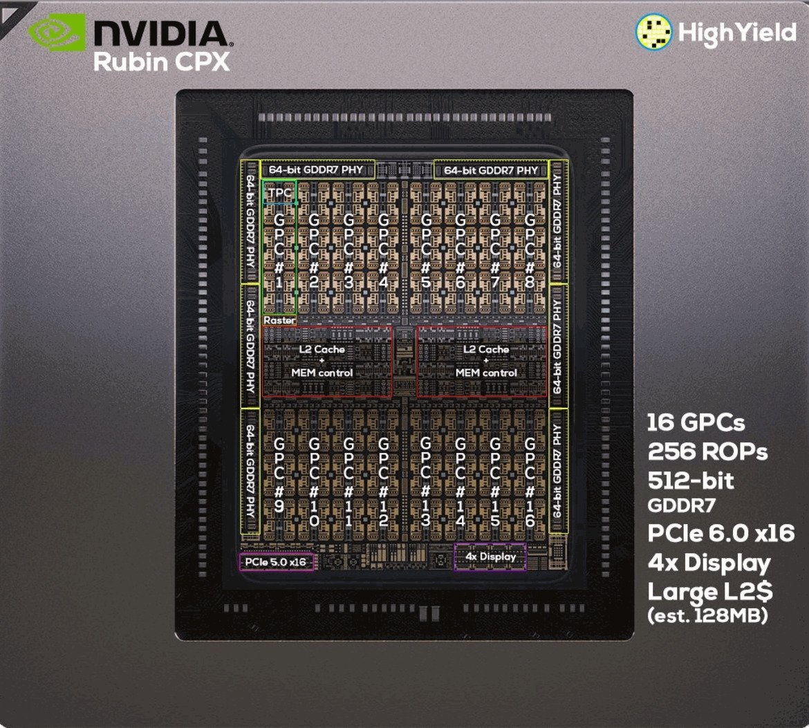 На прошлой неделе корпорация NVIDIA анонсировала процессор Rubin CPX. Он рассчитан на задачи из сферы искусственного интеллекта и выделяется на фоне большинства других ИИ-ускорителей использованием памяти GDDR7. Её объём составит 128 ГБ, а производительность Rubin CPX заявлена на уровне до 30 PetaFLOPS в формате NVFP4. Впрочем, это далеко не самая интересная особенность нового чипа.