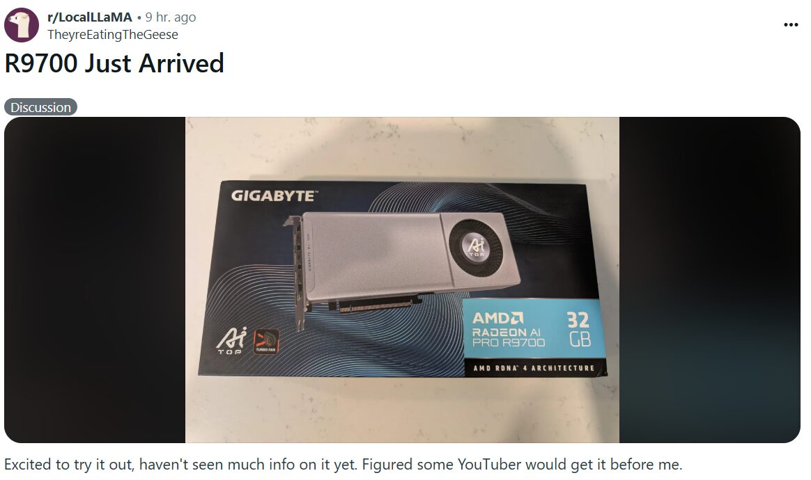 Видеокарта AMD Radeon AI Pro R9700 в первую очередь предназначена для готовых систем от партнёров «красных», но уже в ближайшее время станет доступна как самостоятельный продукт. Более того, она уже начала поступать к первым владельцам. Один из них похвастался на Reddit своим экземпляром Radeon AI Pro R9700 в исполнении компании Gigabyte.