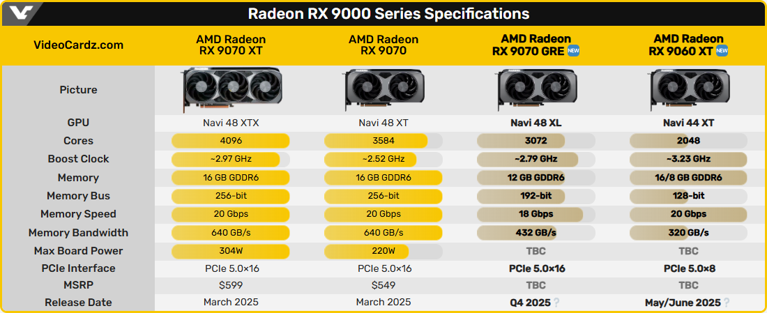 Также сообщается, что AMD решила не спешить с выпуском Radeon RX 9070 GRE на урезанном кристалле Navi 48. Ранее компания предоставила своим партнёрам технические характеристики новой видеокарты, что можно было считать косвенным подтверждением приближения релиза. Если верить источнику, в качестве ориентировочных сроков релиза этой модели теперь указывается четвёртый квартал.
