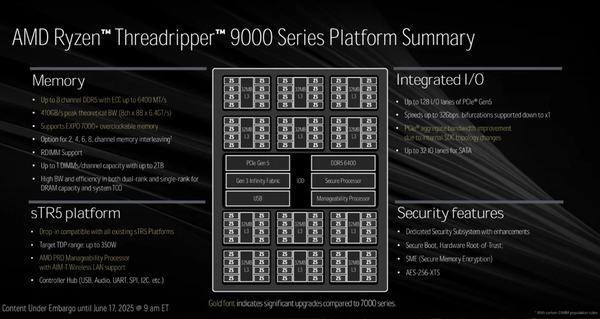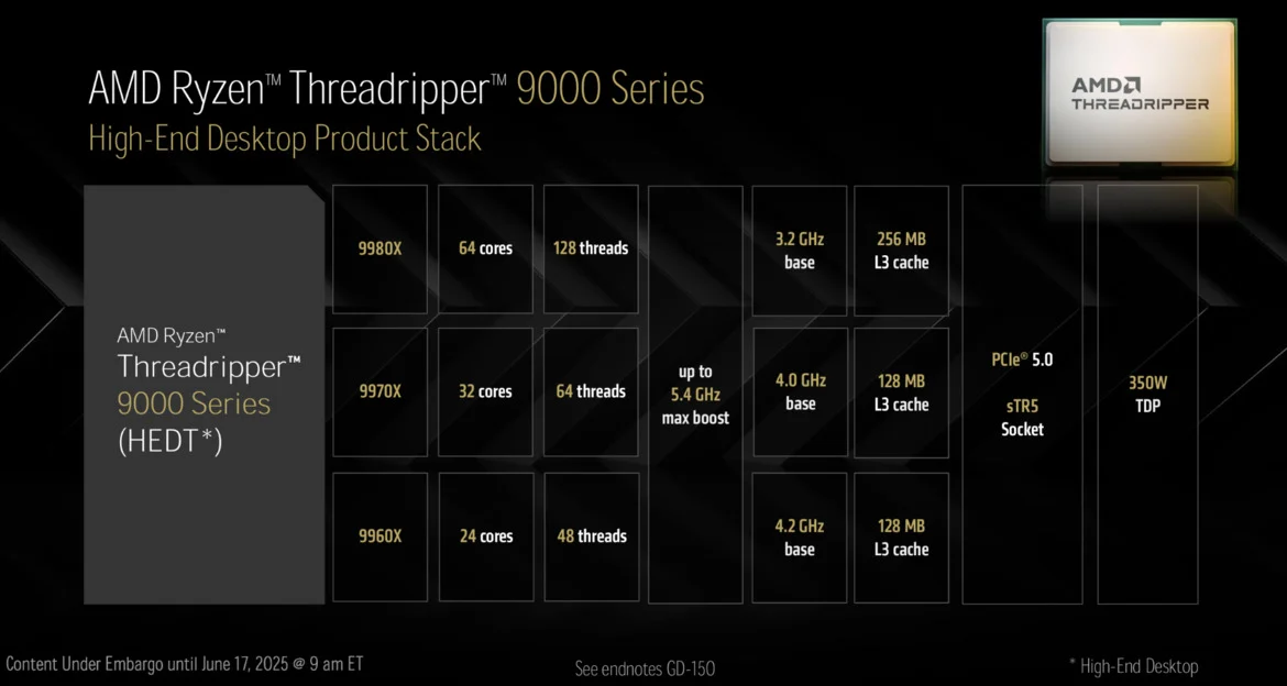 Напомним, процессоры AMD Ryzen Threadripper 9000 и Ryzen Threadripper PRO 9000 имеют конструктивное исполнение sTR5 и будут поддерживаться материнскими платами на чипсетах WRX90 и TRX50 (при условии обновления прошивки UEFI). Главной особенностью новинок стал переход на микроархитектуру Zen 5. Также стоить отметить штатную поддержку оперативной памяти DDR5-6400 и до 128 линий PCIe 5.0, а паспортный уровень TDP у всех моделей составляет 350 Вт.