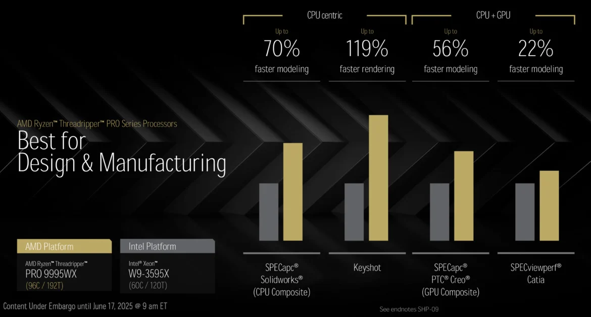 Как отмечает AMD, переход на Zen 5 обеспечил существенную прибавку быстродействия по сравнению как с предшественниками, так и с ближайшими конкурентами. Флагманский Ryzen Threadripper Pro 9995WX в официальных тестах демонстрирует прирост быстродействия до 26% относительно Ryzen Threadripper Pro 7995WX. А в сравнении с Intel Xeon W9-3595X преимущество «красного» CPU в некоторых тестах достигает 108%.