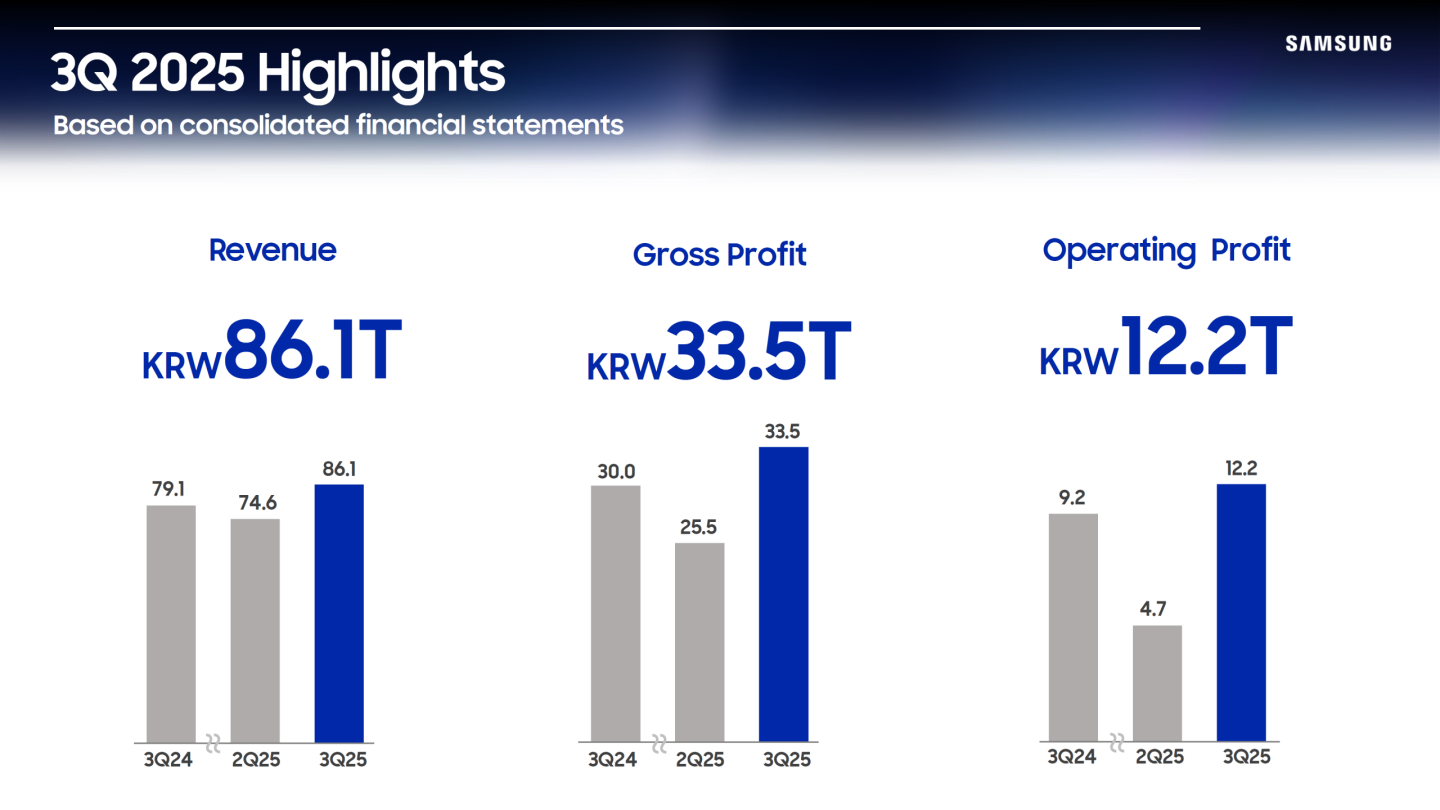 Компания Samsung опубликовала финансовый отчет за третий квартал 2025 года и объявила о планах по выпуску памяти на ближайший год. По итогам квартала выручка выросла на 15,4% в сравнении с прошлым кварталом, и компания установила исторический рекорд квартальных продаж в сегменте памяти. Такой рост обеспечен высоким спросом в сфере ИИ, что стимулирует продажи памяти HBM3E для специализированных ускорителей вычислений и серверных SSD для систем хранения данных.