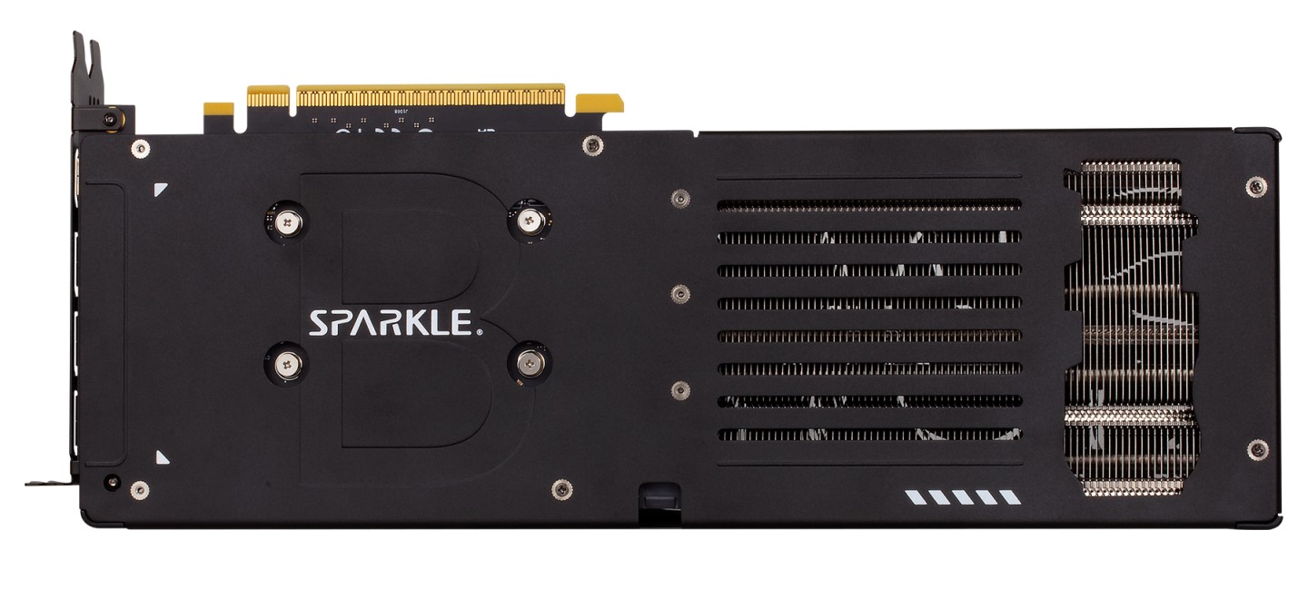 Обратная сторона закрыта металлической пластиной. Есть прорези, чтобы не мешать воздушному потоку внутри корпуса. Вес видеокарты 954 грамма, что на фоне современных графических монстров немного. Но Sparkle даже такой вариант оснастила специальным кронштейном, который поддерживает видеоадаптер внутри корпуса.